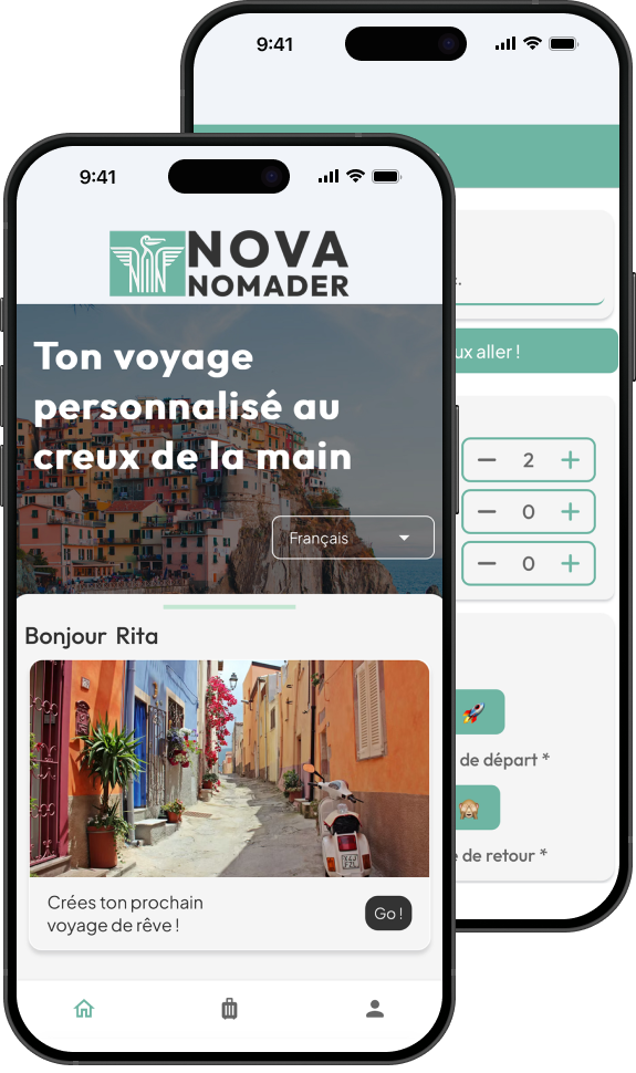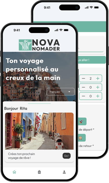 Dites aurevoir au planning stressant et qui prend du temps. Avec NovaNomader, réserver et organiser votre voyage ne prend que quelques swipes pour que vous ayez l'esprit tranquille et plus de temps pour profiter de vos nouvelles aventures